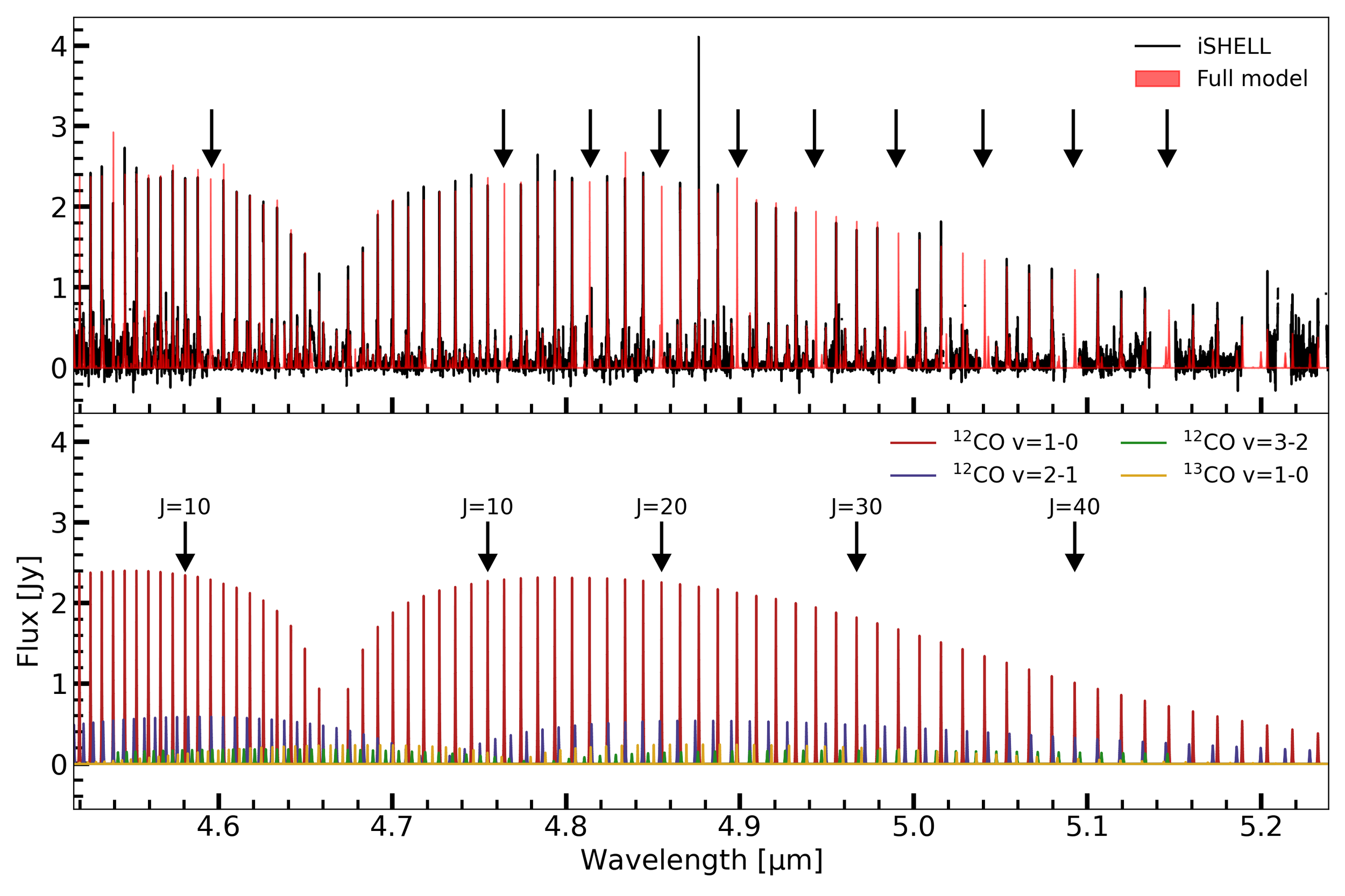 Full model of the CO ro-vibrational spectrum of DR Tau (Temmink et al. 2024a), observed with the IRTF-iSHELL instrument. Displayed are various vibrational bands of ¹²CO (v=1-0, v=2-1, and v=3-2) and ¹³CO (v=1-0).
