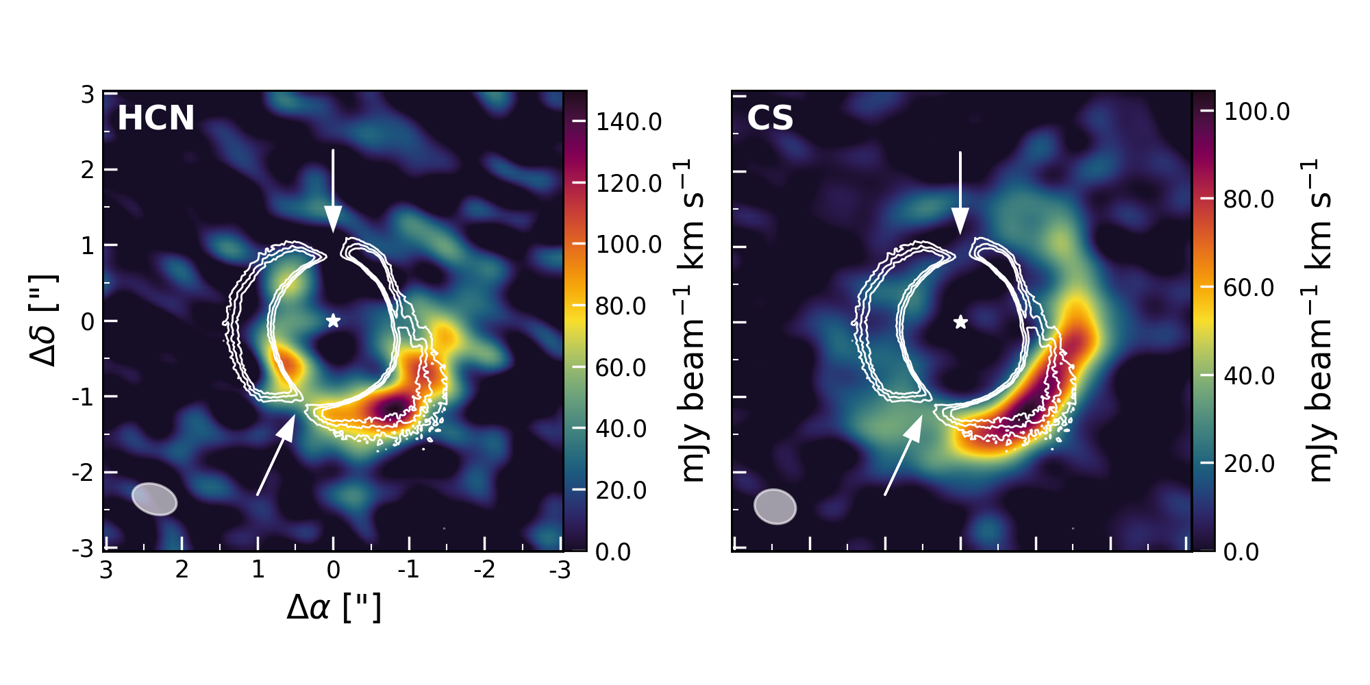 ALMA images of the HCN J=4-3 and CS J=7-6 transitions in the HD 142527 disk (Temmink et al. 2023). The white contours display the scattered light emission, while the arrows point to shadows created by the misaligned inner disk. The shadows and molecular emission appear to be connected, suggesting that the molecular emission layer (of HCN and CS) may be shadowed by the misaligned inner disk as well, creating an azimuthal temperature variation.